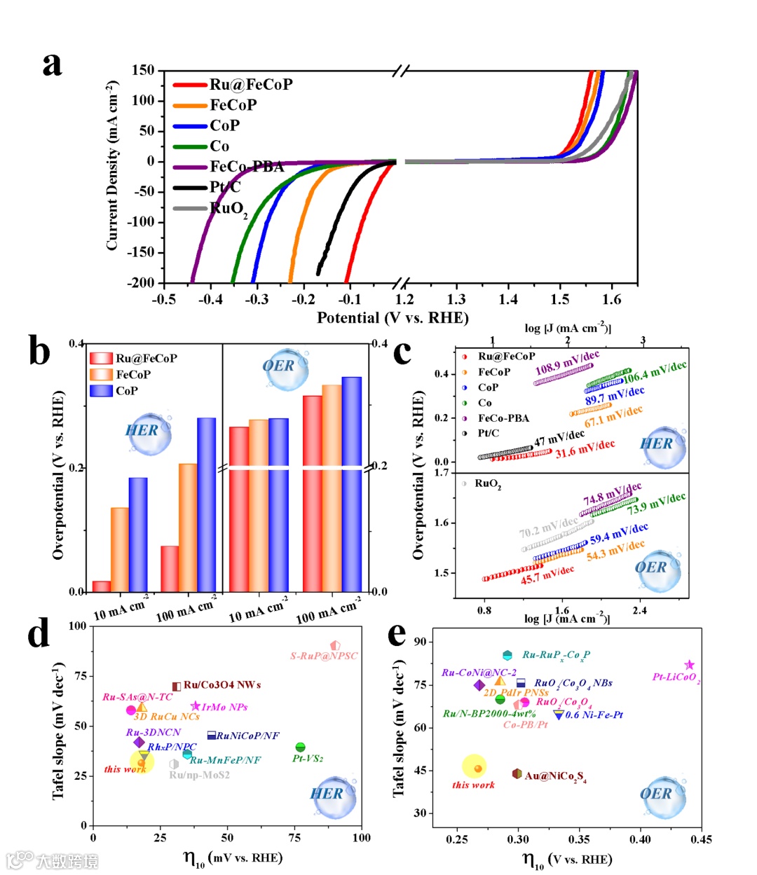 图3. Ru@FeCoP催化剂的电化学性能测试。