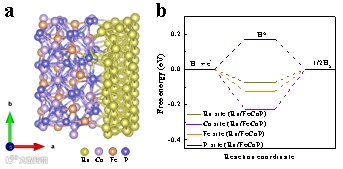 DFT计算结果表明,Ru 位点在 Ru@FeCoP 中的所有原子中具有最低的 ΔGH* 值(-0.073 eV),这也证实了 Ru 位点对 H* 具有最合适的吸附和解吸能力,证实了 Ru位点在 HER 过程中发挥重要的催化作用。