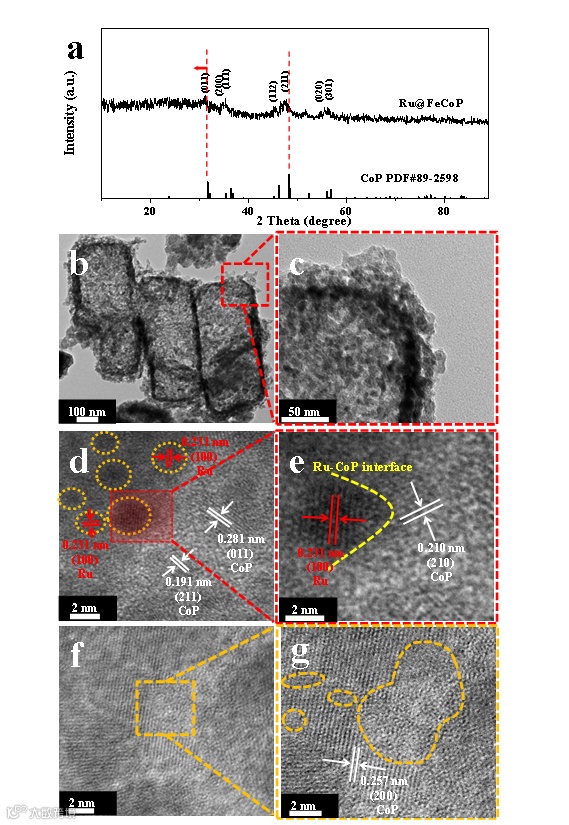 图2. Ru@FeCoP催化剂的XRD以及形貌表征。