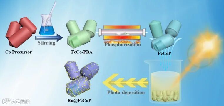 具有耦合效应和电子效应的界面工程策略被认为是丰富催化功能和提高本征活性的最重要的方法之一。本文采用光沉积策略,Ru粒子沉积在FeCoP空心的双锥棱镜上形成Ru/FeCoP界面,新形成的Ru/FeCoP异质界面处电子从Co和Fe定向流向Ru原子,电子结构的优化大大提升了催化剂的催化活性。