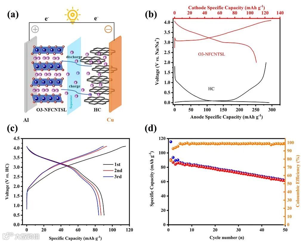 图7. (a)全电池模型;(b)HC和O3-NFCNTSL//HC全电池恒电流充放电曲线;(c)全电池在5mA g-1,0.5-4.1 V电压窗口下的充放电曲线;(d)全电池在20mA g-1,0.5-4.1 V电压窗口下的循环性能