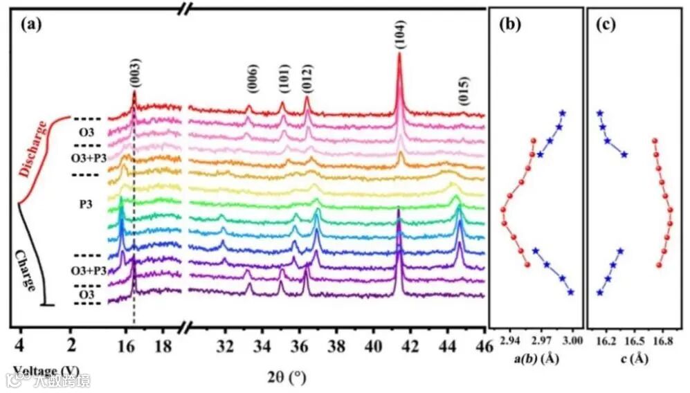 这与常见的O3型正极中普遍存在O3′,O3″,和P3′相不同,该高熵氧化物正极材料在Na+脱嵌过程中并没有观察到这些中间相,说明该正极有利于抑制层状正极材料的复杂相变,提高材料循环稳定性。