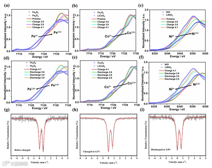 图6.不同荷电状态下的XANES光谱和穆斯堡尔谱图。(a、d)Fe;(b、e)Co;(c、f)Ni;(g)初始态;(h)充电至4.1V;(i)放电至2.0V