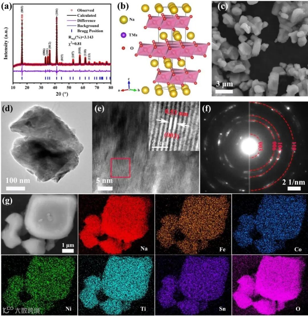 图2. HEO O3-NFCNTSL晶体结构与形貌。(a)XRD精修;(b)结构模型;(c)SEM;(d)和(e)TEM和HRTEM;(f)SAED图;(g)SEM-EDS图.