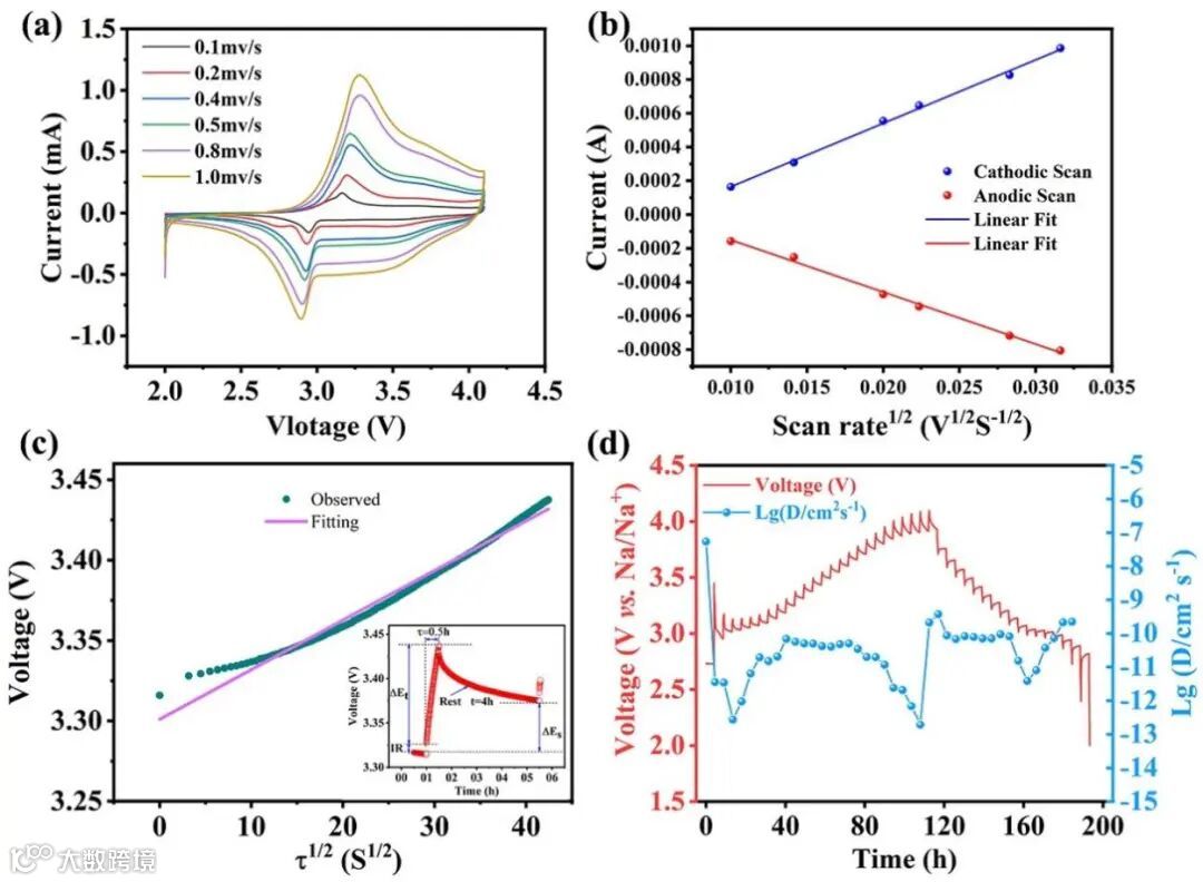 图4. O3-NFCNTSL Na+反应动力学.(a)0.1-1.0mv s-1不同扫速下CV曲线;(b)与的线性拟合结果;(c)和的线性拟合结果;(d)GITT曲线和Na+扩散系数.