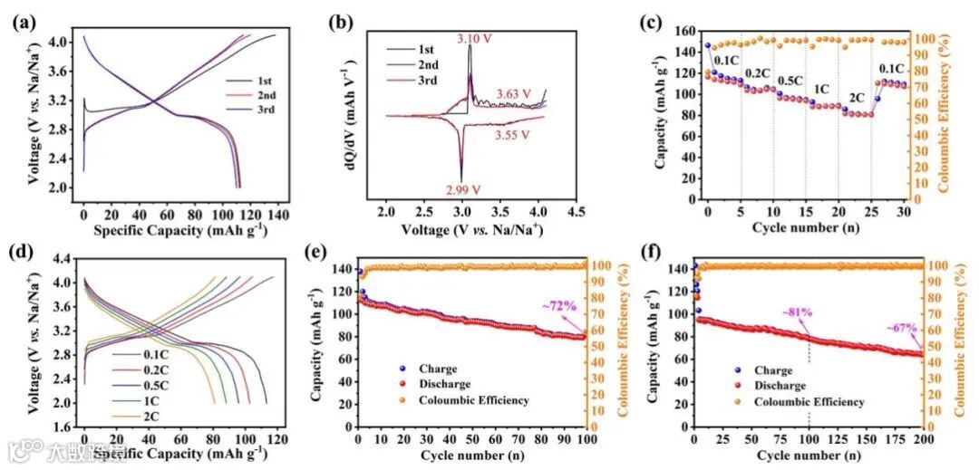 合成的NFCNTSL材料作为钠离子电池正极材料,具有112.7 mAh g-1首次可逆比容量,对应库伦效率为81.8%。在0.1,0.2,0.5,1和2 C不同电流密度下分别具有112.7,103.8,95.2,88.5和80.8 mAh g-1的可逆比容量。在0.1 C历经100次充放电后,可逆容量为81.4 mAh g-1,对应~72%的保持率。在0.5 C下循环200次,NFCNTSL电极具有65 mAh g-1可逆容量,保持~67%的可逆容量。GITT计算获得Na+扩散系数为5.75×10-11 cm2 s-1。dQ/dV曲线展现出良好的重合性,在3.10/2.99 V和3.63/3.55 V(vs. Na/Na+)处出现一对尖锐的峰和一对宽峰,说明该正极具有良好的循环可逆性。