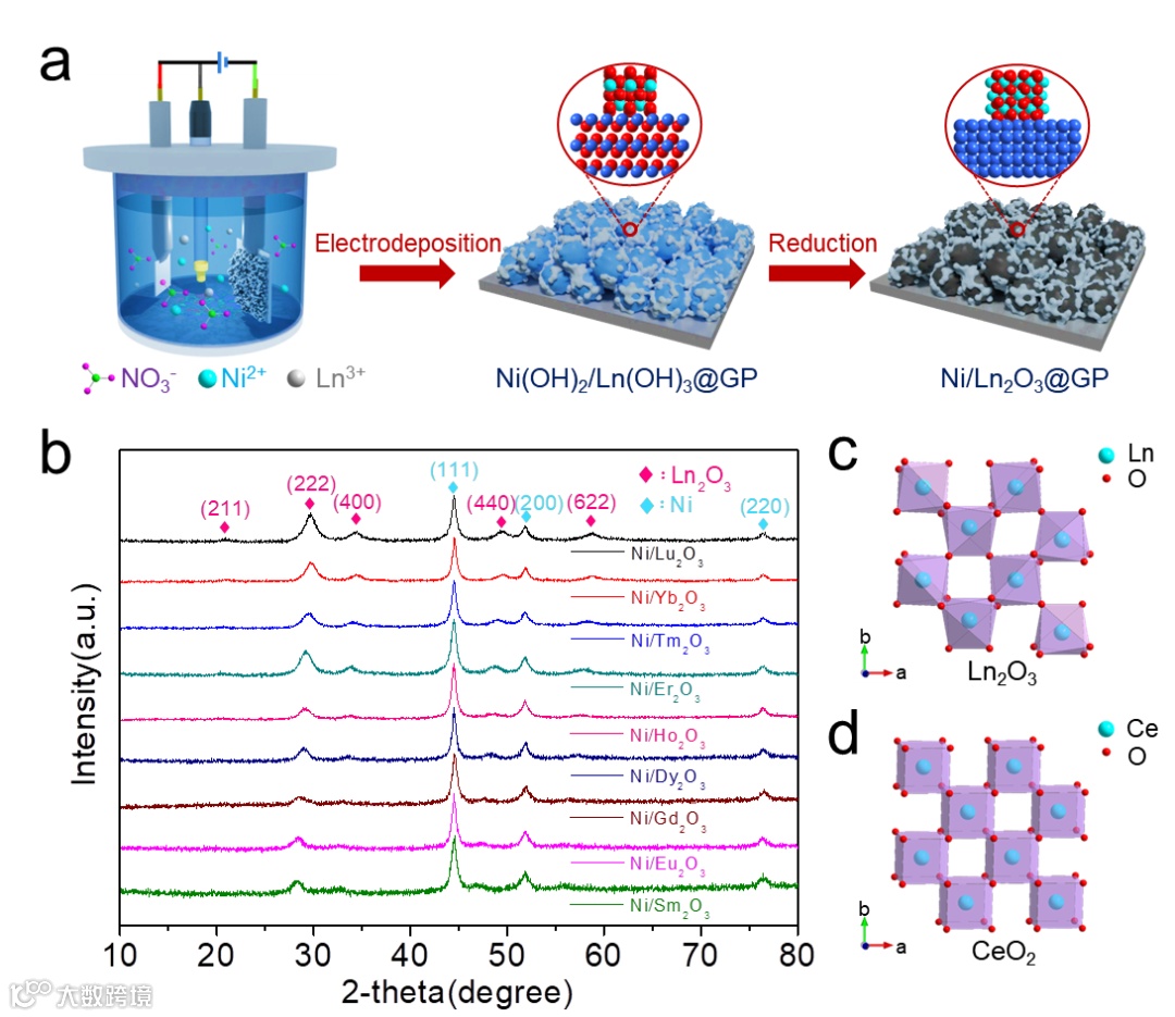 本本发展了阴离子还原电沉积结合选择性高温还原的方法制备Ni/Ln2O3复合催化剂(图1a)。首先采用阴离子(硝酸根)还原电沉积的方法制备Ni(OH)2/Ln(OH)3@GP前驱体电极,原理如下:电解液中包含金属阳离子和硝酸根离子,当施加一定还原电位时,硝酸根在阴极表面被还原,产生大量的氢氧根,溶液的金属离子与这些氢氧根发生沉淀反应,沉积在石墨板表面形成Ni(OH)2/Ln(OH)3前驱体复合物: