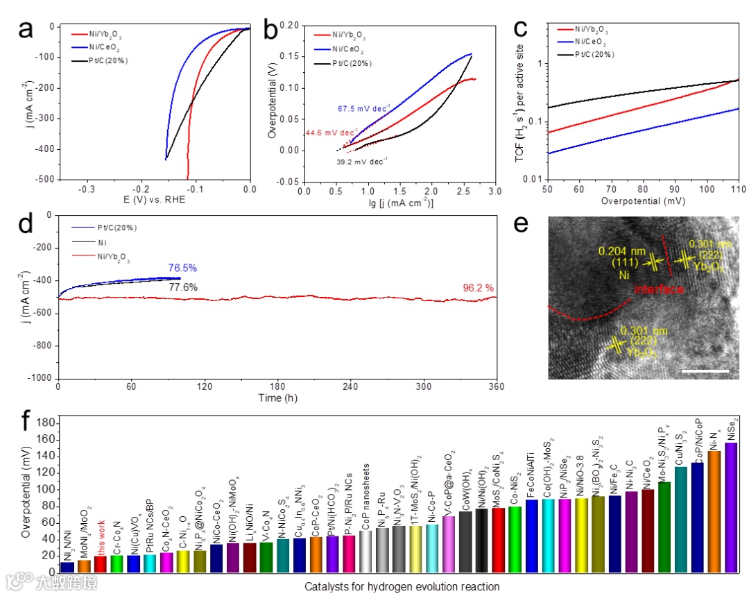 其中Ni/Yb2O3催化剂在电流密度为10 mA cm-2时具有较低的过电位(20.0 mV)、较低的Tafel斜率(44.6 mV dec-1)和大电流密度500 mA cm-2下优异的稳定性(360小时),显著优于金属Ni和Pt/C催化剂。Yb2O3促进剂具有较高的亲氧性和热力学稳定性,能极大地扩大活性位点密度,降低水解离的能垒,优化氢吸附自由能,避免Ni的氧化腐蚀,从而使Ni/Yb2O3的析氢活性和稳定性显著提高。