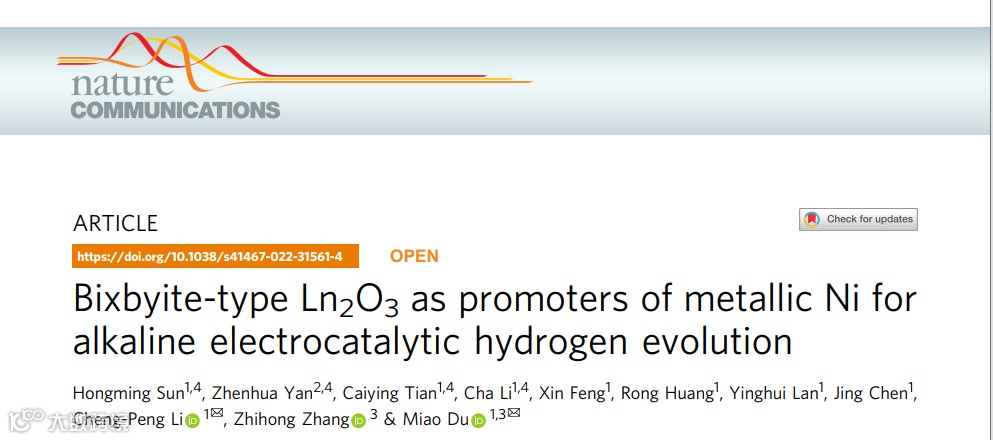基于此,天津师范大学孙洪明博士、李程鹏教授,南开大学严振华副研究员,郑州轻工业大学杜淼教授合作,在国际知名期刊Nat. Commun.上发表题为“Bixbyite-type Ln2O3 as promoters of metallic Ni for alkaline electrocatalytic hydrogen evolution”的研究论文。