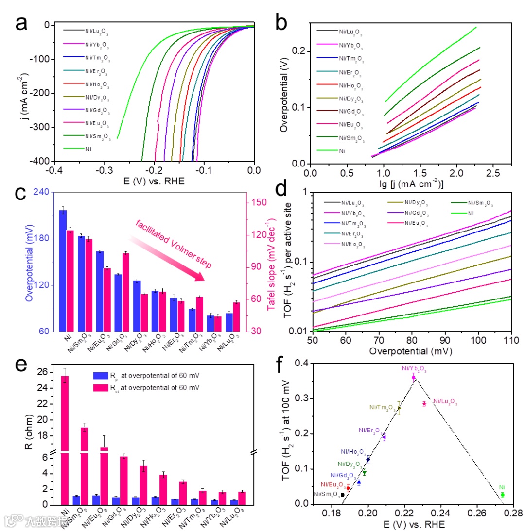 一系列Ni/Ln2O3复合物(Ni/Sm2O3、Ni/Eu2O3、Ni/Gd2O3、Ni/Dy2O3、Ni/Ho2O3、Ni/Er2O3、Ni/Tm2O3、Ni/Yb2O3、Ni/Lu2O3)的HER催化性能测试结果表明:
