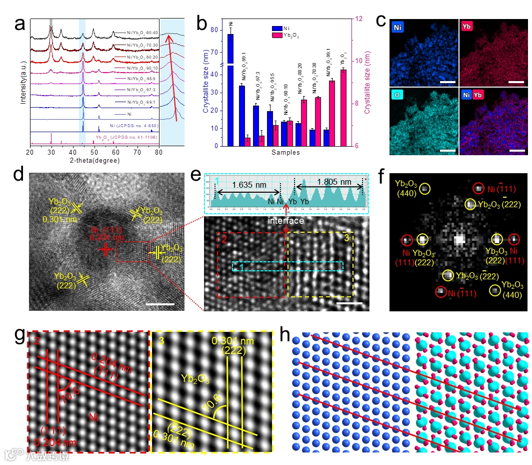 图3. a) 不同Ni:Yb摩尔比Ni和Ni/Yb2O3杂化产物的XRD谱图。b) 根据Debye-Scherrer方程得到的XRD结晶尺寸。c) Ni/Yb2O3元素mapping图谱。d, e) Ni/Yb2O3的HRTEM图像。f, h)快速傅里叶变换(FFT)图案和相应的结构示意图。