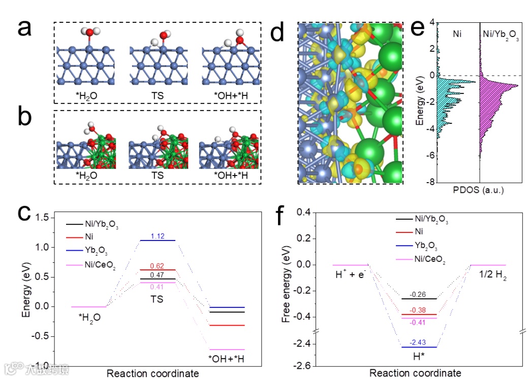 图6 a,b) 金属Ni和Ni/Yb2O3表面H2O解离过程的模型。 c) Ni/Yb2O3、Ni、Yb2O3和Ni/CeO2表面水解离的动力学势垒图。d) Ni/Yb2O3的差分电荷密度图。e) Ni和Ni/Yb2O3中Ni的PDOS图。f)计算Ni/Yb2O3、Ni(111)、Yb2O3、Ni/CeO2体系的ΔGH*。