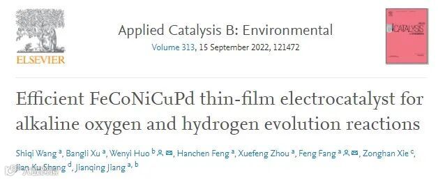 Efficient FeCoNiCuPd Thin-film Electrocatalyst For Alkaline Oxygen and Hydrogen Evolution Reactions. Applied Catalysis B: Environmental, 313 (2022) 121472.
