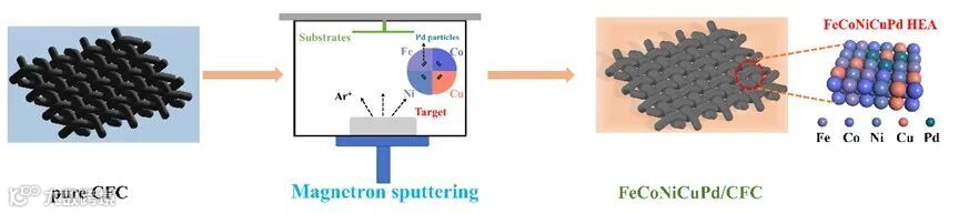 采用磁控溅射法将FeCoNiCuPd薄膜沉积在碳布基底上。FeCoNiCuPd高熵合金为面心立方(FCC)结构,且成分分布均匀, Pd含量控制在10 at%以下。为了对比分析,制备了成分均匀的四元合金薄膜(FeCoNiCu、FeCoNiPd、FeCoCuPd、CoNiCuPd、FeNiCuPd)。