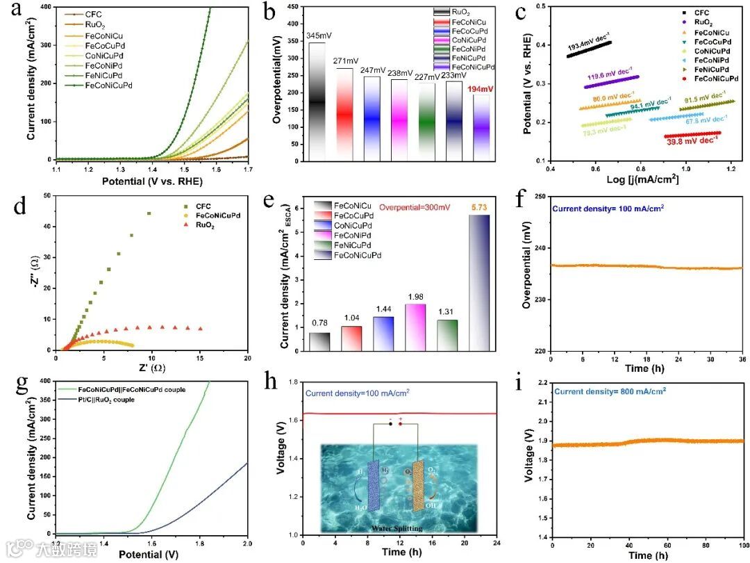 图4 (a-b) 样品的LSV和过电位统计图; (c) 样品的Tafel plots图像;(d)样品的EIS Nyquist图;(e)各样品在300 mV过电位下的单位活性面积电流(f)OER稳定性测试; (g) FeCoNiCuPd || FeCoNiCuPd 和商业催化剂 Pt/C || RuO2 电解槽分解水性能测试;(h-i)不同电流密度下的全解水稳定性测试。