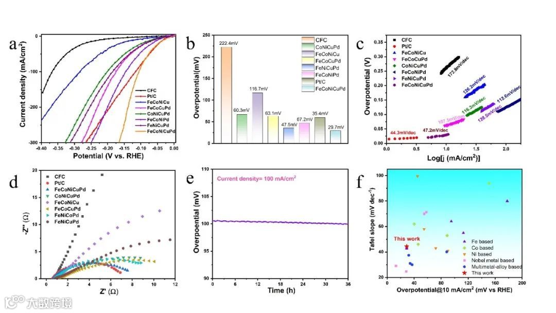 在1 M KOH的电解液中对HER活性进行评估,结果表明,FeCoNiCuPd具有表现出极高的活性催化性能。在HER中,只需 29.7 mV过电位便可达到10 mA·cm-2电流密度,优于商用Pt/C催化剂;同时,与四元合金催化剂相比,FeCoNiCuPd具有最快的反应动力学,Tafel斜率低至47.2 mV dec-1,稳定性良好。