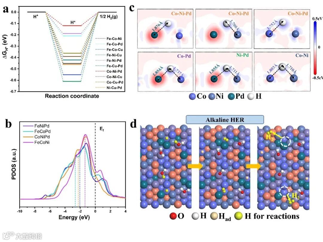 图5. (a-c)DFT计算结果揭示HER过程的活性位点构型;(d)FeCoNiCuPd催化剂的HER过程机理示意图。