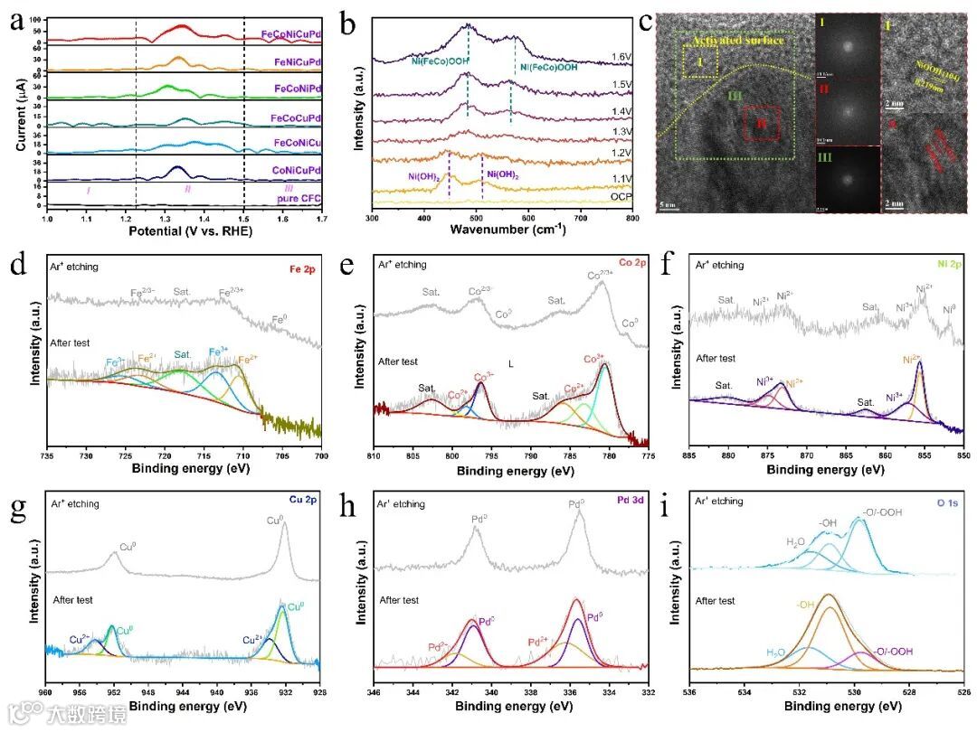图6 (a)样品FTACV测试图谱;(b)FeCoNiCuPd的原位拉曼测试结果;(c)OER测试后样品的HRTEM图;(d-i)OER测试后样品的XPS图谱。