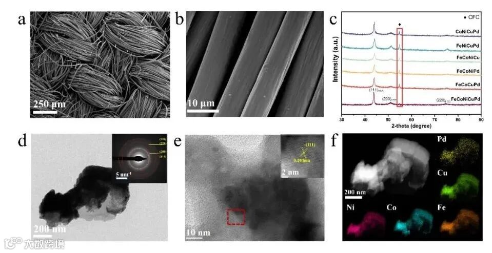 图2 (a-b)FeCoNiCuPd/CFC的SEM图;(c)高熵合金及四元合金薄膜样品的XRD图谱 (d) FeCoNiCuPd的TEM图;(e)FeCoNiCuPd的HRTEM图;(f)FeCoNiCuPd的HADDF-STEM和EDX mapping图;