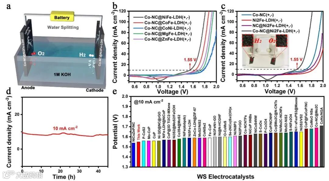 图5. 各催化剂在1 M KOH 条件下的全水解性能:(a)使用Co-NC@Ni2Fe-LDH作为阳极和阴极材料的两电极体系图;Co-NC@ Ni2Fe -LDHs(b)以及对比样品(c)的LSV曲线;(c)中的插图是Co-NC@Ni2Fe-LDH测试全水解性能时的照片;(d)Co-NC@Ni2Fe-LDH在1.55 V的施加电压下的i-t曲线。(e)与其它含Co或含Ni全水解电催化剂在10 mA cm-2时所需电压的对比。