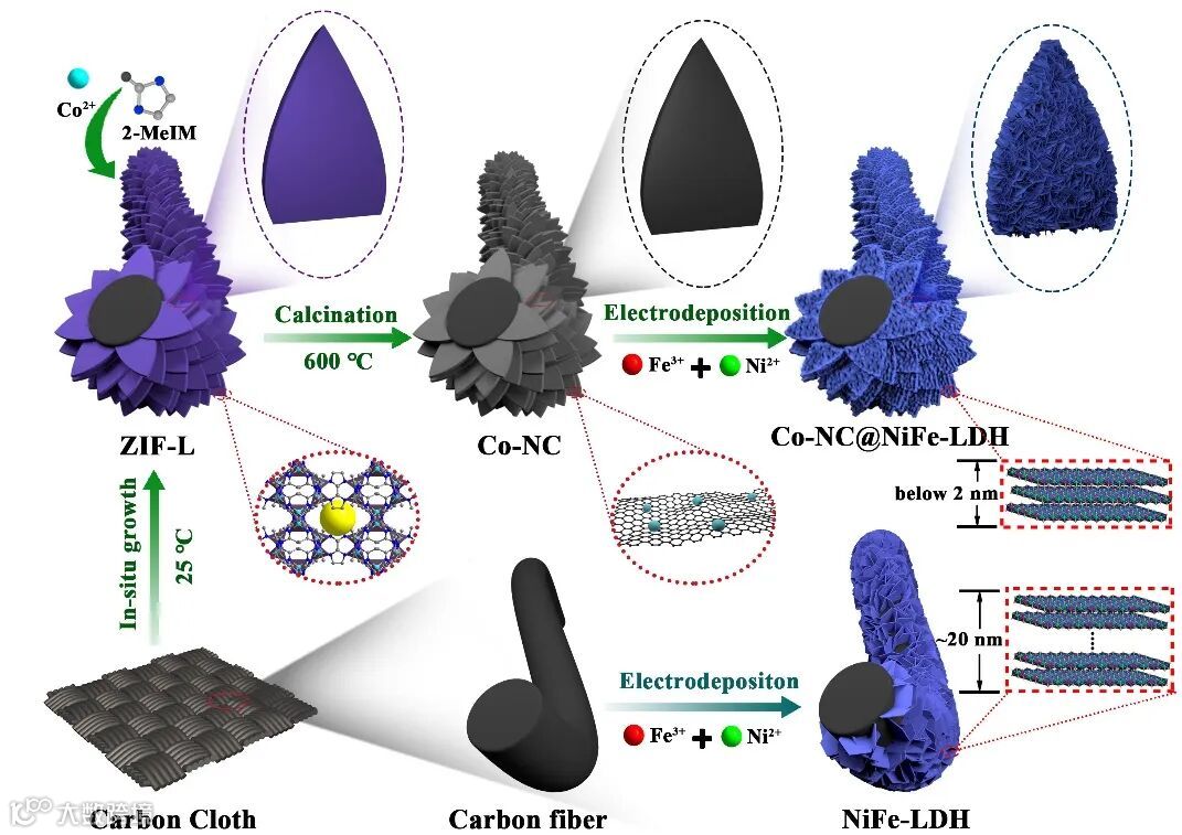 图1. Co-NC@NiFe-LDH 和 NiFe-LDH材料在碳布上的制备流程和尺寸对比。
