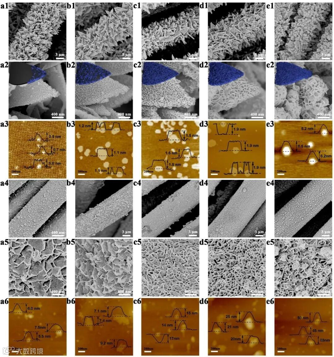 图3. Co-NC@Ni2Fe-LDH(a1-e1,a2-e2,a3-e3)和Ni2Fe-LDH(a4-e4,a5-e5,a6-e6)在电沉积时间为50(a1-a6)、100(b1-b6)、(c1-c6)150、(d1-d6)200和(e1-e6)300s时相应的SEM图和AFM图。图a2-e2中的插图为Co-NC@Ni2Fe-LDH.的形貌演变图。