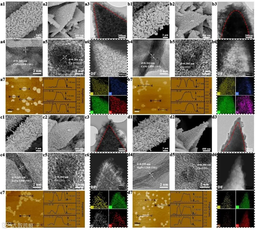 图4. Co-NC@CoFe-LD(a1,a2)、Co-NC@CoNi-LDH(b1,b2)、Co-NC@ZnFe-LDH(c1,c2)和Co-NC@MgFe-LDH(d1,d2)的低倍和高倍SEM图。Co-NC@CoFe-LDH(a3-a7)、Co-NC@CoNi-LDH(b3-b7)、Co-NC@ZnFe-LDH(c3-c7)和Co-NC@MgFe-LDH(d3-d7)的TEM(a3-d3)、HR-TEM(a4-d4,a5-d5)、HAADF-STEM(a6-d6)和EDS 元素分布图。