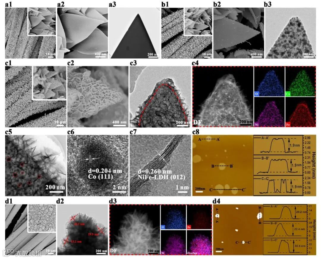 图2. (a1-a3)ZIF-L,(b1-b3)Co-NC,(c1-c3)Co-NC@Ni2Fe-LDH和(d1,d2)Ni2Fe-LDH的低倍和高倍SEM图和TEM图。Co-NC@Ni2Fe-LDH和Ni2Fe-LDH的AFM图(c8,d4)和EDS元素分布图(c4,d3)。Co-NC@Ni2Fe-LDH的高倍TEM图(c5)和高分辨TEM(HR-TEM)图(c6,c7)。