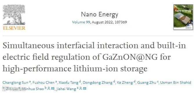 为解决这些问题,王家海教授团队联合香港科技大学邵敏华教授合作,在国际顶级期刊Nano Energy(影响因子:17.881)上发表题为“Simultaneous interfacial interaction and built-in electric field regulation of GaZnON@NG for high-performance lithium-ion storage”的研究工作,孙长龙博士后第一作者,广州大学第一单位,王家海教授和邵敏华教授共同通讯。