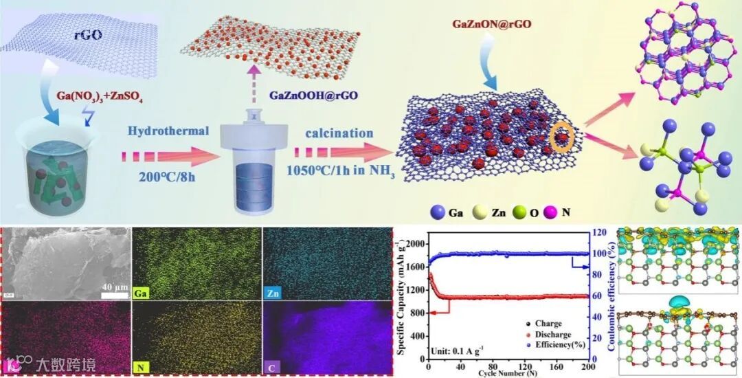 该工作利用氧化石墨烯表面含氧基团作为金属离子吸附活性位点的原理,得到石墨烯复合GaZnON纳米颗粒,利用内建电场的调控作用,增强GaZnON与石墨烯间界面耦合作用,并充分利用GaZnON的结构优势与石墨烯良好导电性之间的协同效应,增强GaZnON电化学性能。理论计算研究进一步表明,石墨烯复合GaZnON表面电子发生聚集并进行重新分布,从而促进电荷迁移,增进表面耦合作用,通过表面工程设计的界面结构,不仅能增强GaZnON表面电子密度,还能极大提高充放电过程中的电荷迁移扩散效率,降低锂离子迁移能带壁垒,增强电池倍率和循环等电化学性能。