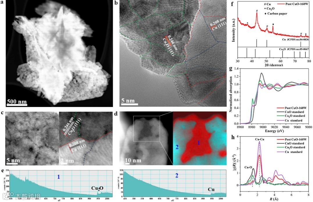 图3. 电化学重构CuO纳米片的结构和成分表征
