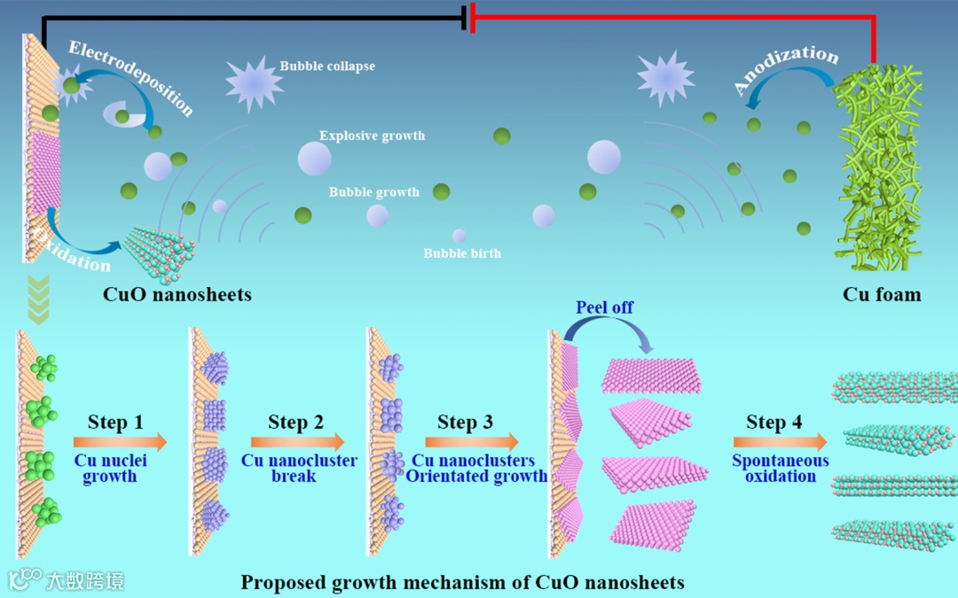 图1. 超声辅助电沉积制备CuO纳米片的合成示意图