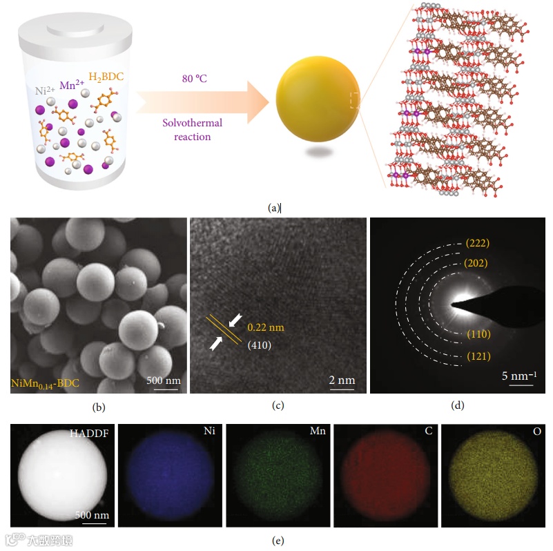 通过一步水热法制备出双金属NiMn-BDC MOF。NiMn-BDC与Ni-BDC表现出相同的球状结构。