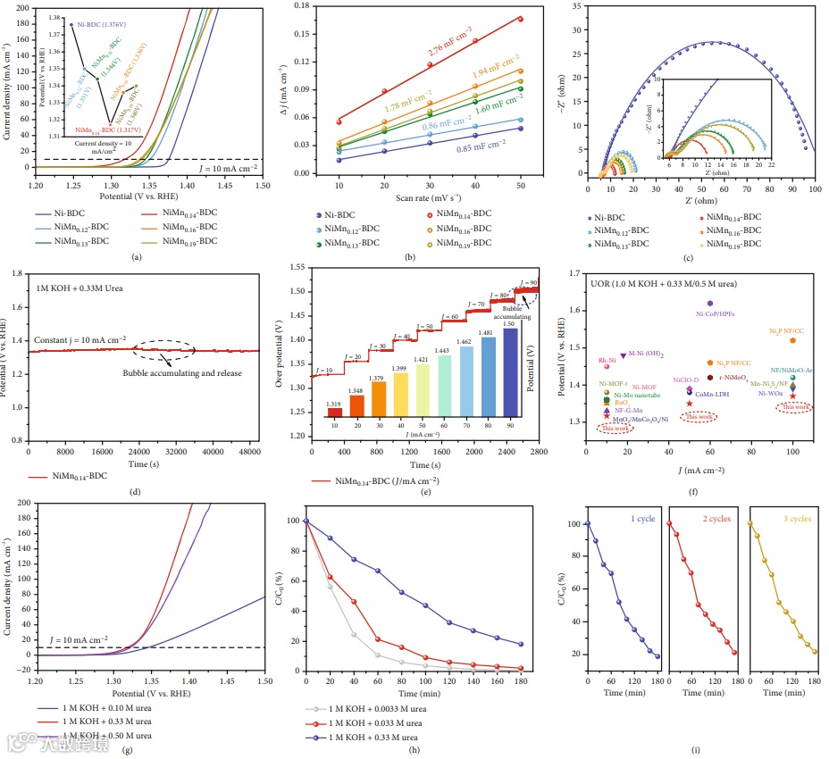 在UOR反应过程中,相对于单位点催化剂Ni-BDC和Mn-BDC,双位点催化剂NiMn-BDC表现出更为优异的性能。其中,NiMn0.14-BDC仅需要1.317 V的低电压便可提供10 mA cm-2的电流密度,在 1.4 V 的电压下实现了 0.15 s-1 的高转换频率 (TOF),优越于近期报道的Ni基及Mn基催化剂。作者也做了计时电位测试和倍率性能测试以证实催化剂优异的稳定性。鉴于其优异的UOR催化性能,作者对NiMn0.14-BDC在不同浓度的模拟尿素废水中对其尿素降解性能进行了探讨。结果表明,其对0.0033 M, 0.033 M 和0.33 M尿素废水的尿素降解率分别达到97.65%, 96.71% 和81.87%,并具有良好的循环稳定性。