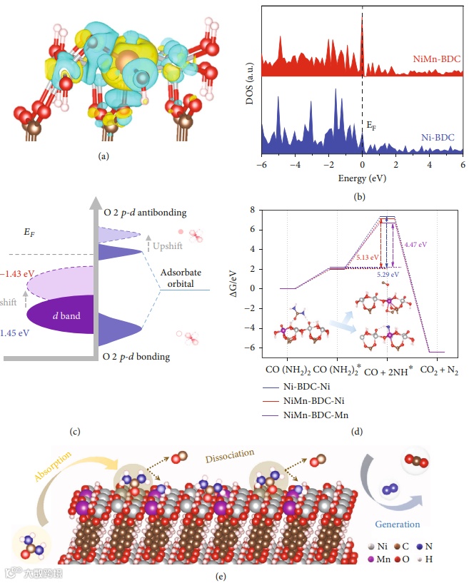 基于此,华中科技大学王春栋团队联合中国科技大学熊宇杰团队在Research上发表题为“Metal-Organic Frameworks Offering Tunable Binary Active Sites toward Highly Efficient Urea Oxidation Electrolysis”的研究文章。该研究文章通过以金属有机框架(MOF)为平台来定制二元活性位点以打破标度关系,降低UOR反应势垒。研究者发现,双金属NiMn-BDC 与Ni-BDC具有类似的晶体结构,但电子结构发生较大变化。并且通过实验和理论研究证明第二位金属Mn的引入会诱导电荷的重新分布并使d带中心向费米能级移动。揭示了在 UOR 过程中,Ni 和 Mn 位点在操纵尿素分子和关键反应中间体的演化中发挥协同作用。最终优化所得的催化剂材料表现出了优异的UOR活性和尿素降解效率,有望作为UOR催化剂实现高效电解水制氢及尿素废水处理。