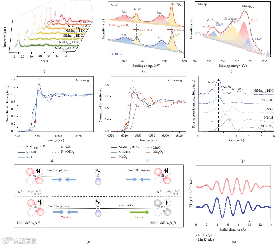 NiMn-BDC仍维持Ni-BDC的晶体结构,但结晶性减弱。Mn的引入使MOF催化剂中氧空位浓度增大,并且显著提升其比表面积,使催化剂活性位点高度可及,从而提升其UOR催化性能。过渡族金属的电子结构很大程度上影响了反应中间体在催化剂表面的吸附。XPS和同步辐射数据表明Mn占据了部分Ni位点的位置,重新排布了Ni周围的电子,使Ni的价态升高。