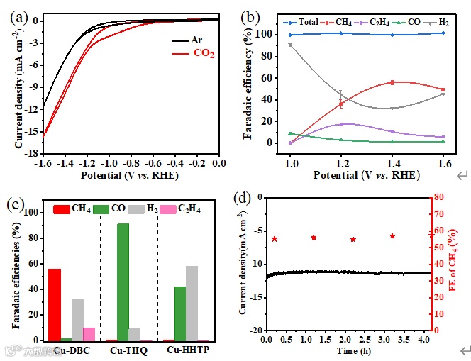 基于CuO5节点的Cu-DBC在-1.4 V vs. RHE时,产物CH4的法拉第效率达到56%。与Cu-DBC相比,具有CuO4节点的Cu-HHTP和Cu-THQ在电催化CO2还原中还原产物只有CO和H2