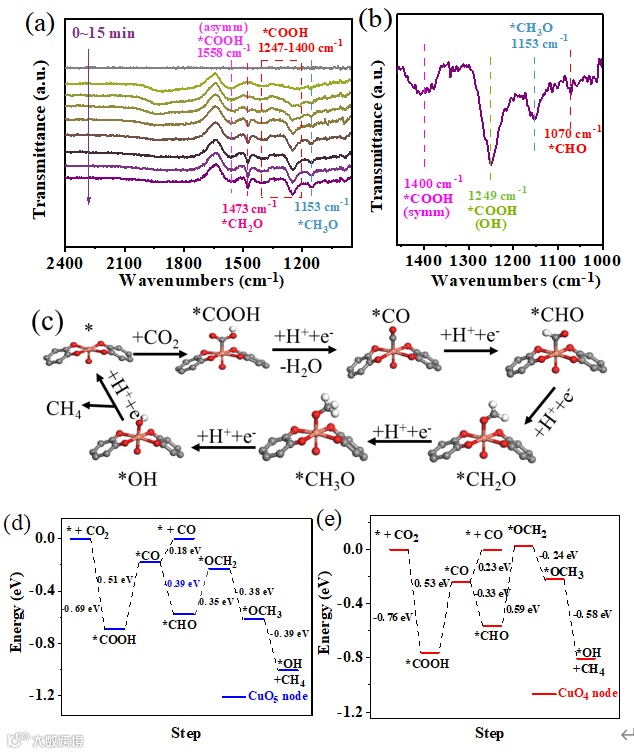 图 3. (a, b)Cu-DBC的CO2还原Operando ATR-FTIR 表征;(c)基于方形椎体CuO5上可能的CO2还原路径;(d, e)方形锥体CuO5 和方形平面CuO4 节点上CO2 还原途径的自由能图。