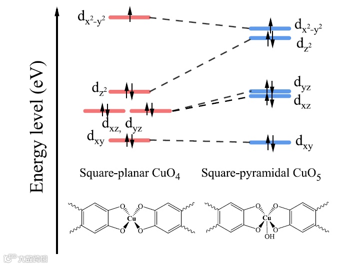 图1. 基于周期性密度泛函理论(PDFT)计算得到的CuO4和CuO5位点中Cu 3d轨道能级分裂情况