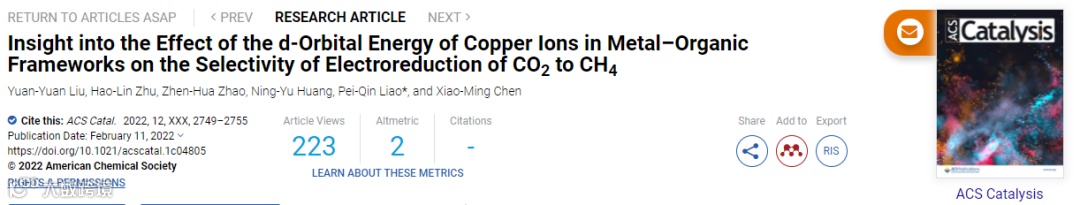 在这里,中山大学化学学院的廖培钦教授课题组,在国际知名期刊 ACS Catalysis 上发表题为“Insight into the Effect of the d-Orbital Energy of Copper Ions in Metal–Organic Frameworks on the Selectivity of Electroreduction of CO2 to CH4的文章。