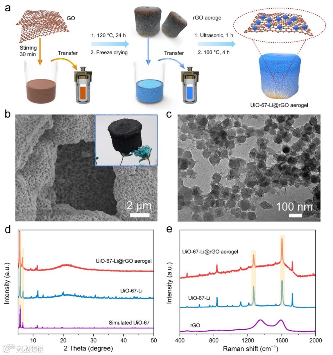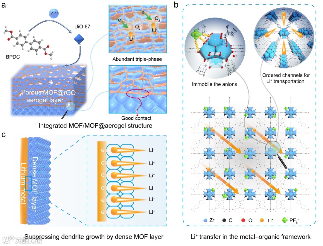 研究者首先使用水热法与后处理方法制备出了具有丰富不饱和位点与定向锂离子传输通道的固体电解质材料UiO-67-Li。通过在多孔导电石墨烯气凝胶上原位生长固体电解质材料UiO-67-Li,成功构筑了具有连续三相反应界面和良好固-固接触界面的固态空气正极,能够同时实现离子/电子传输以及快速的气体扩散(图1a)。UiO-67-Li骨架中丰富的不饱和位点与定向的锂离子传输通道会使锂盐快速解离。解离出的阴离子会被骨架中暴露的不饱和位点所固定,导致自由移动的锂离子数量增多,从而提升电解质材料的离子电导率和锂离子迁移数(图1b)。此外,得益于致密的电解质层所构筑的坚硬壁垒,可以有效抑制锂枝晶刺穿的问题(图1c)。