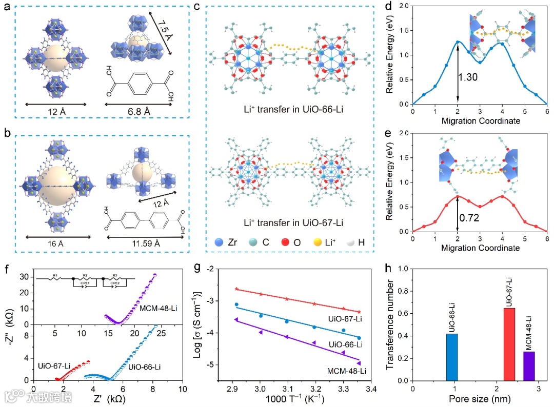 为了探究孔径对离子传导性能的影响,研究者制备了同样具有丰富不饱和位点的UiO-66-Li,其拓扑结构与UiO-67-Li相同,但孔径小于UiO-67-Li(图3a,3b)。理论计算结果表明UiO-67-Li具有更低的锂离子迁移势垒(图3c-e),这是由于较大的分子孔通道会允许更有效的锂离子溶剂化并施加较小的限制效应。UiO-66-Li的离子电导率为0.069 mS cm−1,低于UiO-67-Li的离子电导率0.64 mS cm−1,这证实了较大孔道在锂离子传输中的关键作用(图3f)。而MCM-48-Li的离子电导率最低为0.011 mS cm−1,这表明不饱和位点对离子电导率具有重要影响。此外,UiO-67-Li的活化能为0.14 eV,与计算结果非常匹配(图3g)。UiO-67-Li的锂离子迁移数为0.65,但UiO-66-Li和MCM-48 Li的迁移数分别为0.42和0.26(图3h),这意味着大量的不饱和位点和更大的孔径可以促进锂离子的传输并限制阴离子的运动。