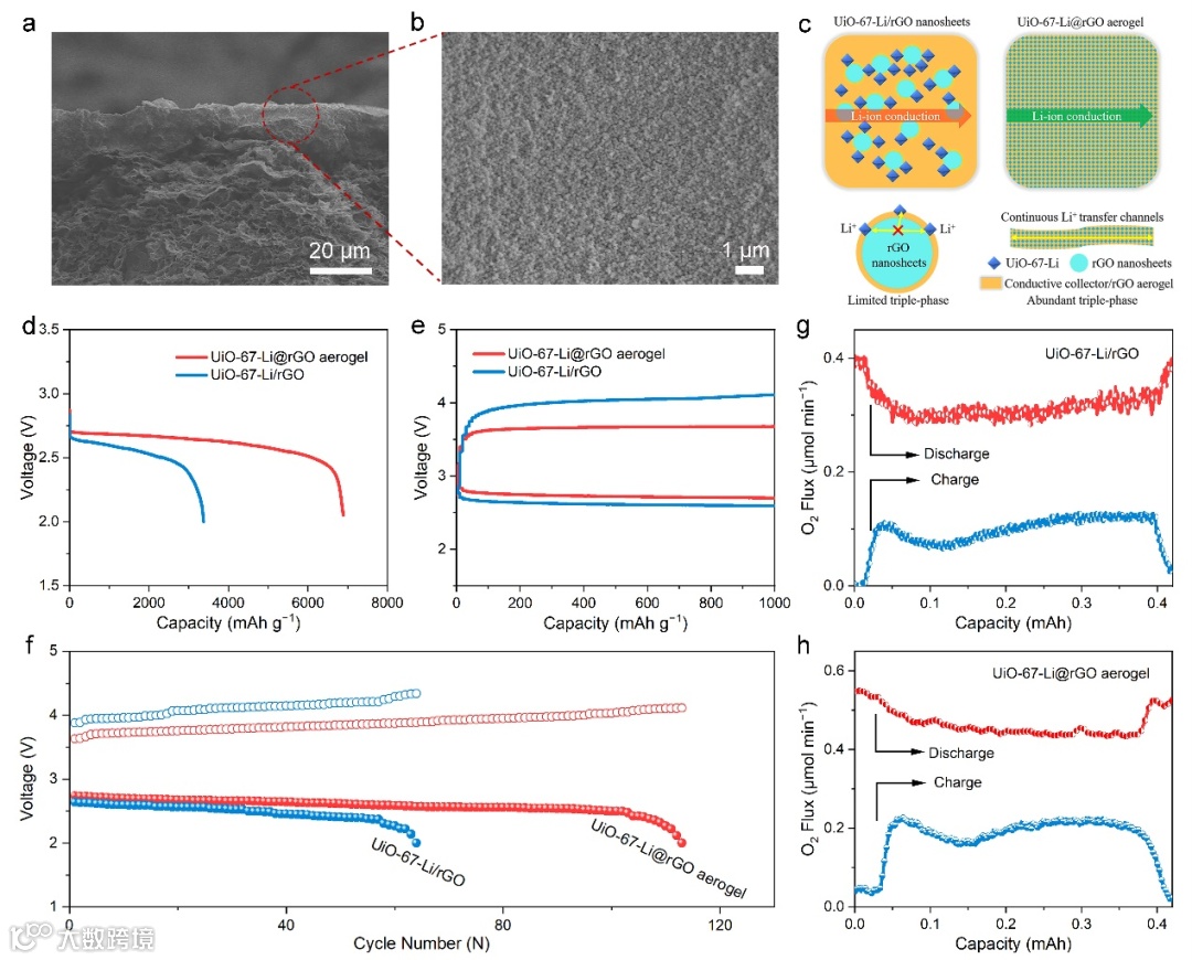 结合UiO-67-Li固态电解质和UiO-67-Li@rGO aerogel固态空气正极的优点,研究者制备了用于固态Li–O2电池的一体化MOF/MOF@rGO aerogel结构。扫描电镜图像证明,厚度约为10 μm的UiO-67-Li固态电解质层致密地涂覆在UiO-67@rGO aerogel正极上(图5a,b)。致密的UiO-67-Li固态电解质层不仅可以提供高锂离子电导率,而且能够与电极紧密接触,从而实现低界面传输电阻(图5c)。对电池进行全放电测试,结果表明UiO-67-Li@rGO aerogel结构使固态Li–O2电池的放电容量可以达到6891 mAh g−1。而具有UiO-67-Li@rGO aerogel的固态Li–O2电池的过电位也显著降低(图5d,5e)。另外,具有UiO-67-Li@rGO aerogel的固态Li–O2电池表现出长达115次的循环稳定性(图5f)。原位差分电化学质谱结果也证明了具有UiO-67-Li@rGO aerogel结构的固态Li–O2电池在循环过程中具有更好的可逆性(图5g,h)。