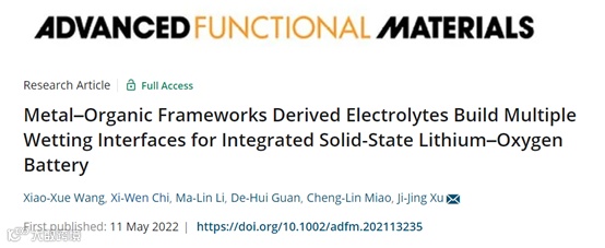 近日,来自吉林大学的徐吉静教授团队,在国际知名期刊Advanced Functional Materials上发表题为“Metal–Organic Frameworks Derived Electrolytes Build Multiple Wetting Interfaces for Integrated Solid-State Lithium–Oxygen Battery”的研究文章。该文章通过调控金属有机框架材料(MOF)的不饱和金属位点和分子孔道尺寸,成功制备了MOF基固态电解质,并构建了固态电解质/固态电解质、固态电解质/电极之间的多个低阻抗界面,构筑了高安全、高稳定的固态锂氧气电池。该研究基于UiO-67 MOF材料制备了具有高离子传导性能、高空气稳定的新型固态电解质材料UiO-67-Li。此外,通过在多孔导电石墨烯气凝胶基底上原位生长该电解质材料的方法,获得了具有电子、离子和分子连续传输通道的固态空气正极UiO-67-Li@rGO,同时构筑了润湿的“电解质/电极”低阻抗弹性接触界面。由于具有定向的离子传输通道和丰富的离子传输位点,UiO-67-Li固态电解质展现出高达6.4×10−4 S cm−1的离子电导率、高达0.65的锂离子迁移数、以及对空气组分和负极的高度稳定性,有效解决了现有固态电解质材料稳定性差和界面构建困难等问题。另外,通过原位生长策略对MOF固态电解质材料与电极材料进行一体化设计,构筑了低阻抗电极/固态电解质界面,有效提升了锂离子的传输。基于上述设计,固态锂氧气电池展现出达115次的可逆稳定循环。该研究为构建高性能固态电解质材料和高安全长寿命的固态金属锂电池开辟了一条新的路径。该文章发表在国际期刊Advanced Functional Materials上。博士生王晓雪为本文第一作者。