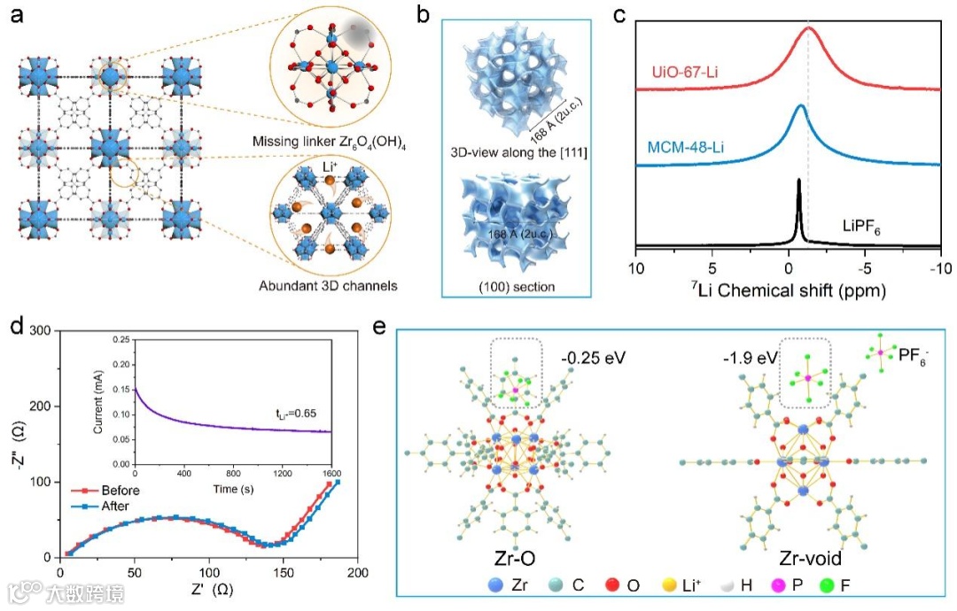 图2a和2b是UiO-67-Li与MCM-48-Li的结构示意图,从图中可以看出UiO-67-Li具有丰富不饱和位点和定向锂离子传输通道,而MCM-48-Li则没有不饱和位点。UiO-67-Li骨架中丰富的不饱和位点会有利于固定锂盐阴离子,这与固体核磁的结果一致(图2c)。更高的锂离子迁移数,也很好地表明了UiO-67-Li在固定阴离子和促进锂离子传输方面具有出色的能力(图2d)。对阴离子吸附能的理论计算结果进一步证实了上述结论(图2e)。