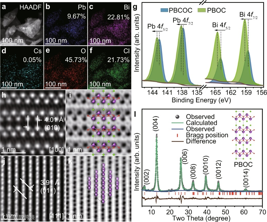 图 2. 超薄 PBOC 层的结构和组成。a-f STEM-EDS 元素mapping图像和相应的元素原子含量。g超薄PBOC层的Bi 4f和Pb 4f XPS光谱。h-k 原子级分辨的逆FFT HAADF-和 BF-STEM 图像,提供了标记的区域轴(为清楚起见,图 k 中省略了 O 和 Cl 原子)。l 对 PXRD图的Le Bail拟合结果。