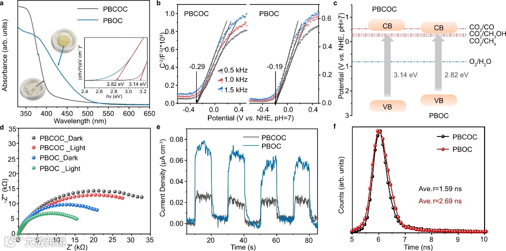 图3. 超薄 PBOC 层和块状 PBCOC 的光谱和光电特性。a 紫外-可见漫反射光谱。插图:相应的光学图像和获得的 2.82 和 3.14eV的带隙。b 莫特-肖特基图。c 电子能带结构示意图;灰色箭头表示光照射下的电子跃迁过程。CB,导带;VB,价带。d 电化学阻抗谱。e 在 0.1MNa2SO4 电解质溶液中,在 0.5Vvs Ag/AgCl 电极电位下,在全光谱下具有光开/关循环的瞬态光电流密度。f 时间分辨荧光光谱。