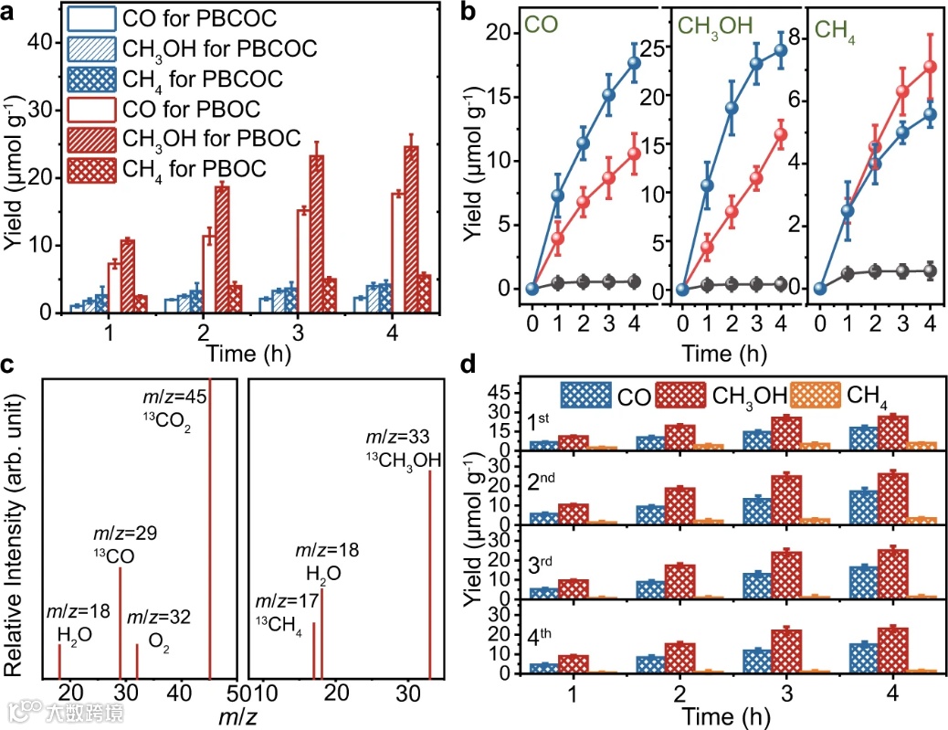 图 4. 超薄 PBOC 层和块状PBCOC 的光催化 CO2RR 性能。a 全光谱光照射下的光催化 CO2RR 产物。b 超薄PBOC在全光谱光照射下,在N2(灰球)、大气CO2(红球)和纯CO2(蓝球)中的光催化CO2还原活性。c 含有 13CO2 的产物的 GC-MS 谱图。d 4h全光谱光照射下的 CO2RR 循环测量。误差线是三个重复的平均值±标准偏差。