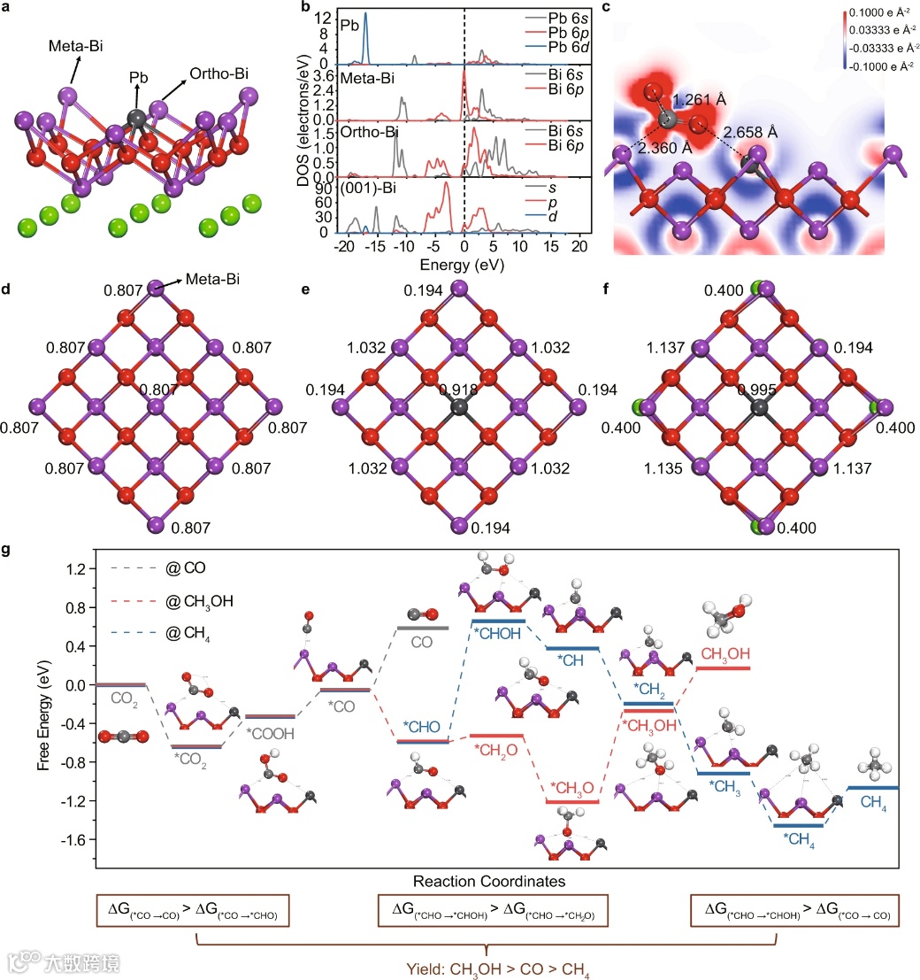 图5. 超薄PBOC层的电子结构和CO2RR路径。(a)铅-卤氧化铋外层结构模型和(b)部分态密度(PDOS)。c 差分电荷密度的等值面。(d) 层状卤氧化铋层、(e)铅-卤氧化铋外层和 (f) 吸附 CO2 后的铅-卤氧化铅外层的 Mulliken 电荷数。g 不同反应路径的吉布斯自由能图。灰色、红色和蓝色线分别显示 CO2RR生成 CO、CH3OH 和 CH4 的反应途径。