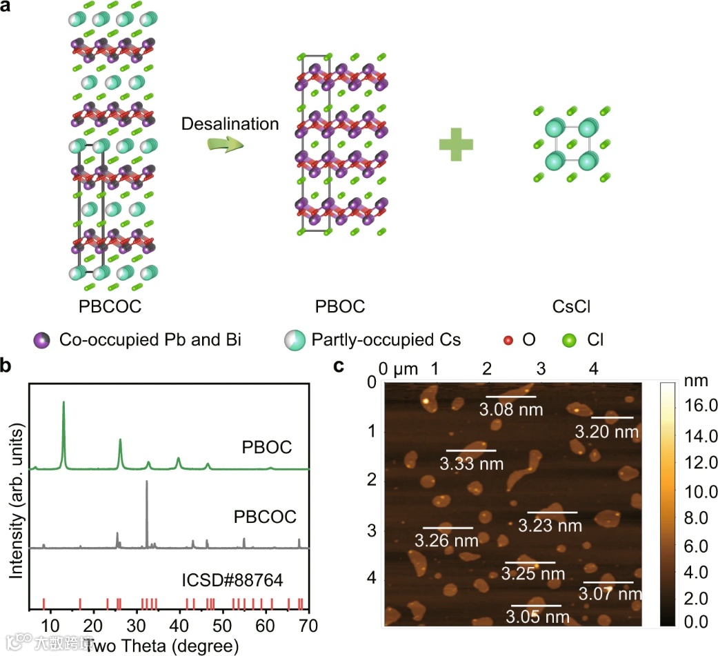 图 1. 超薄 PBOC 层的合成和表征。a 通过脱盐策略从 PBCOC 合成超薄 PBOC 层的示意图。b PBCOC 和 PBOC 的PXRD图。c 合成后的超薄 PBOC 层的 AFM 图像。